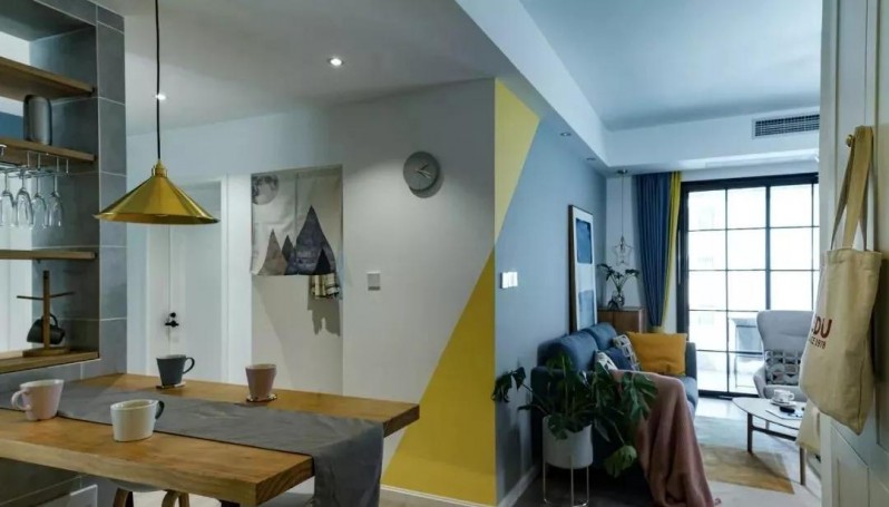 玄關(guān)對面餐廳和廚房,從玄關(guān)的角度看,背景墻面做一小塊兒乳膠漆分色處理,形成一種撞色的效果,與客廳的窗簾顏色相呼應(yīng)。