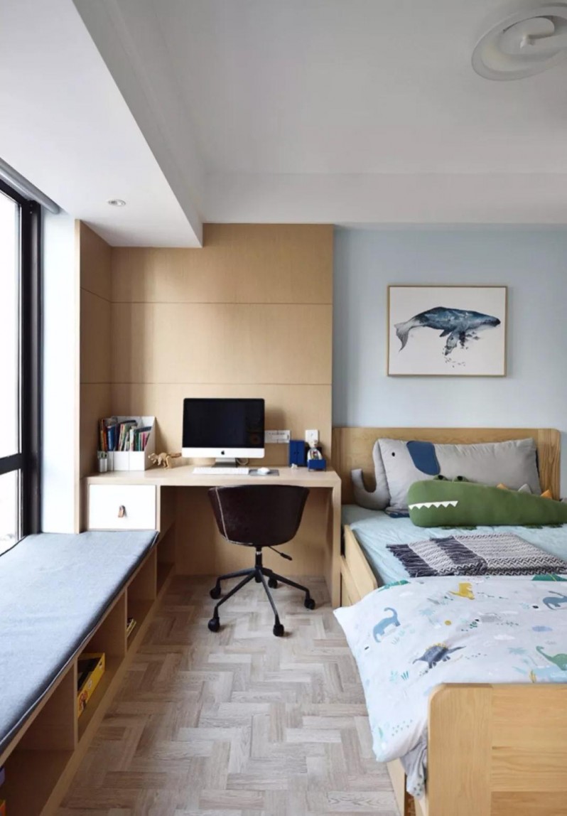 飄窗改工作區(qū),將飄窗改成工作區(qū),明亮的光線也有利于學(xué)習(xí),書桌旁的小書柜或吊柜,也為存放資料提供了空間,無(wú)論是存放還是拿取,抬手就能做到,很方便!
