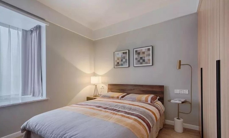 淺灰色床背景點(diǎn)綴兩幅簡框畫,實木家具質(zhì)感,創(chuàng)造自然溫馨的就寢環(huán)境,飄窗打造成臥室的休閑一隅。