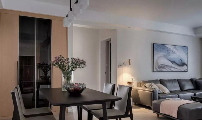 餐廳與客廳互通,木作一組置頂酒柜作背景。木質(zhì)餐桌椅搭配簡約款吊燈,整體色調(diào)與風(fēng)格保持一致。
