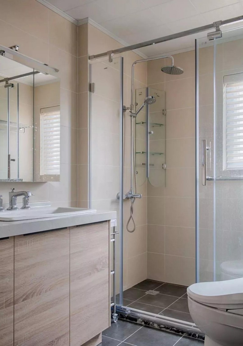 衛(wèi)生間,深色地磚搭配暖黃色墻面磚,木紋柜門與整室木色呼應(yīng)。