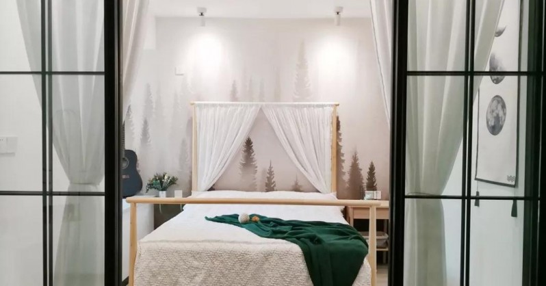 硬朗質(zhì)感的黑框玻璃移門,清新別致的迷霧森林壁紙,帶來硬朗與柔和的碰撞。雙人床的自然原木色更增加了房間的森系空氣感。