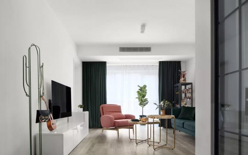淡山茱萸粉的單人沙發(fā),瞬間減弱了空間中墨綠色的深沉感。素凈淡雅的色彩,簡單流暢的線條,飽含生氣而不失氣質(zhì)。