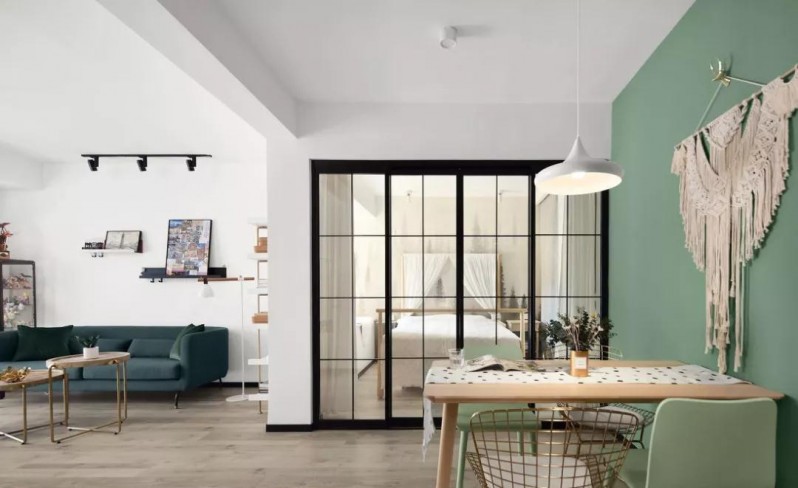臥室采用現(xiàn)代感十足的黑框玻璃移門設(shè)計(jì),視覺更通透、更寬敞,同時(shí)也增加了餐廳區(qū)域的自然采光。