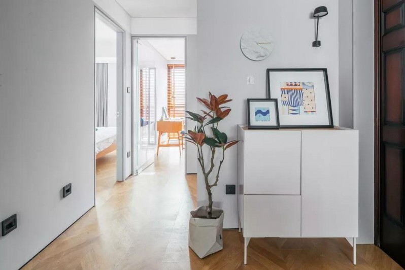 線條纖細(xì)卻有力,足夠安放進(jìn)出門的鞋履;右側(cè)柜體內(nèi)部特別設(shè)計(jì)了衣架,讓“隔夜衣”有了很好的去處。新式大理石面板的時(shí)鐘極具創(chuàng)意,配上設(shè)計(jì)師靈感乍現(xiàn)DIY的裝飾畫,清新淡雅,是初遇的時(shí)刻。