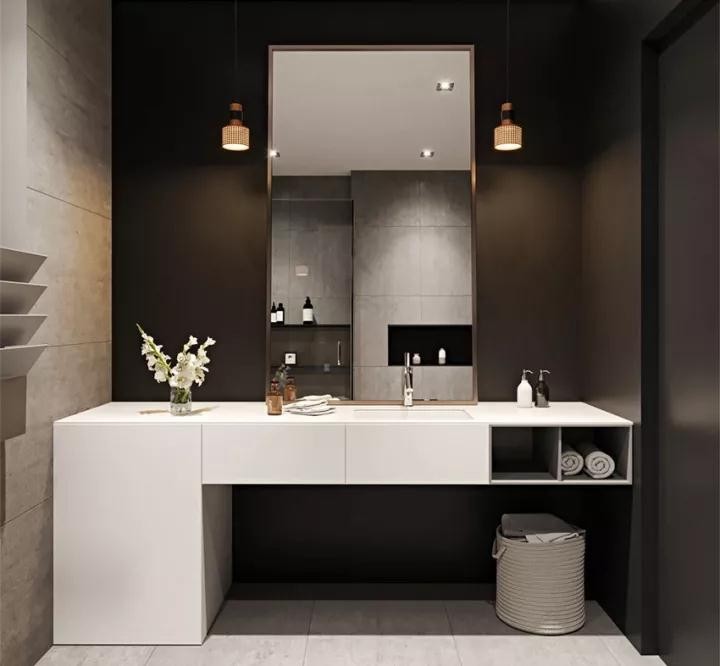 做不了大型浴室柜,那選擇做吊柜總是可以的吧,吊柜下方的空間可以收納臉盆用,如果覺(jué)得直接放地上不好的話,可以搭配一個(gè)矮的木架子做收納。因?yàn)榉旁谙旅婊旧喜挥绊懻w視覺(jué),而且拿起來(lái)也比放柜子里方便。