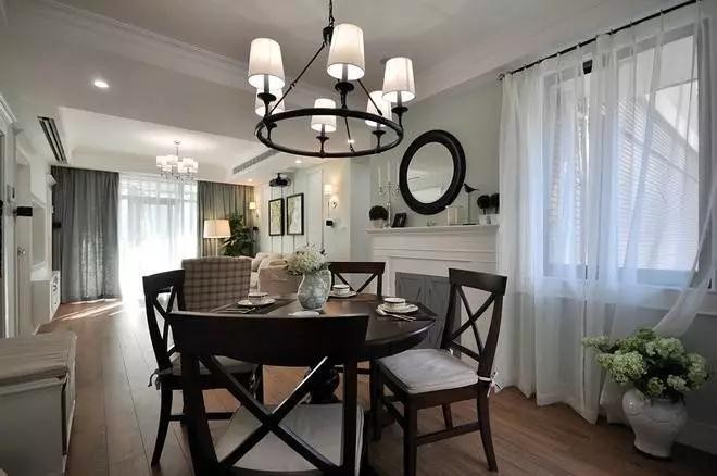 餐桌擺放在過道正中間,深咖色餐桌餐椅自成一體,在灰色背景墻的反襯下,更顯厚重而質(zhì)感,餐桌是特意選擇了圓形,可以盡量多的容納人,兩三個(gè)親朋好友來,也是有地方坐的,比起餐桌,顯然背景墻更具有裝飾性,仿真壁爐設(shè)計(jì),既顯出背景墻的層次感,同時(shí)還延伸出做擺臺(tái)的置物臺(tái),旁邊是素凈的白紗簾,清透而顯韻味。