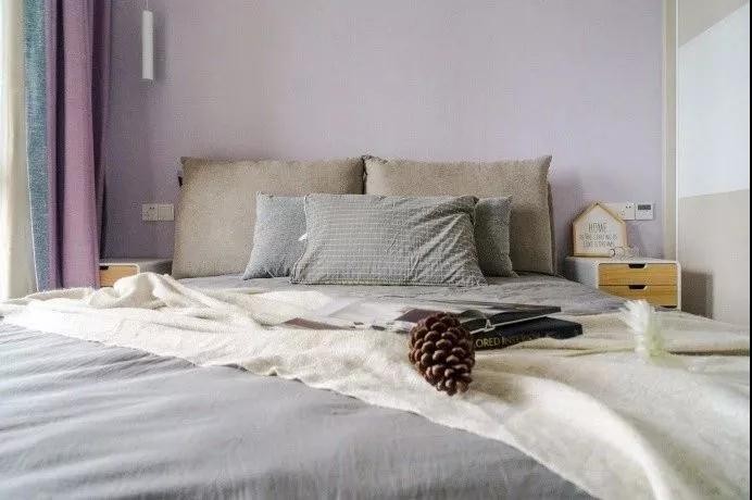 主臥也沒有太繁雜的裝飾,簡單的粉紫色刷漆,同樣色系的窗簾搭配,很有整體感。