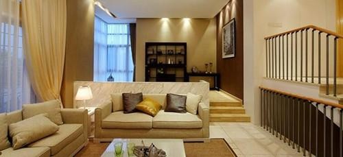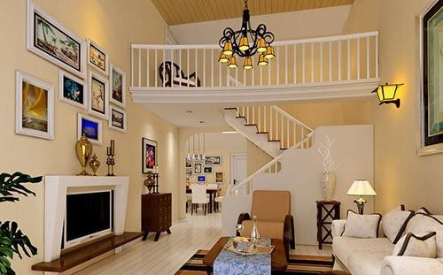 對于歐式風格的小復式,可以看到客廳主要一面,把客廳中間的上空打掉,設計成一個漂亮的高廳,然后利用高廳,可以把樓梯設計在這個區(qū)域,可以形成一個景觀,而且不占面積,旋轉(zhuǎn)的樓梯顯得非常的高貴。
