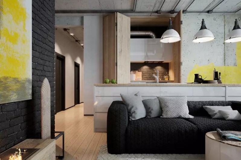 客廳也是極簡的設(shè)計,黑色墻磚與抽象藝術(shù)品配合,再加上極簡的電視柜,沙發(fā)和茶幾,視覺上不再單調(diào)。