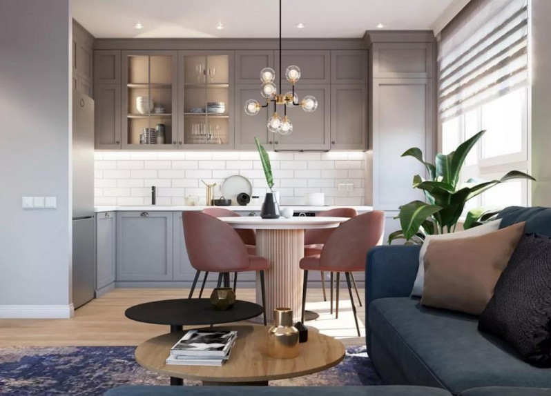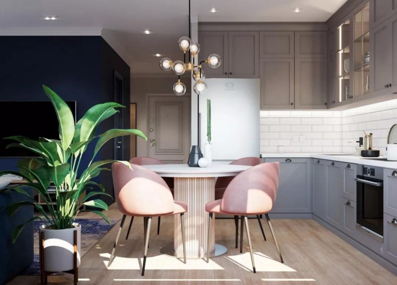 餐廳區(qū)域四把粉色靠背的現(xiàn)代餐椅,是視覺的焦點(diǎn),與灰色的廚房同處一個空間,讓整個區(qū)域顯得更加活潑可愛。