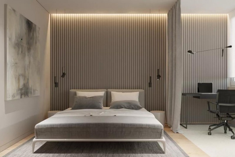 臥室區(qū)域總面積為13平方米,入門兩側(cè)是兩個(gè)獨(dú)立衣柜,而上方還做了一個(gè)辦公區(qū),配色平和簡(jiǎn)潔。