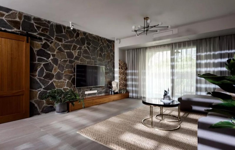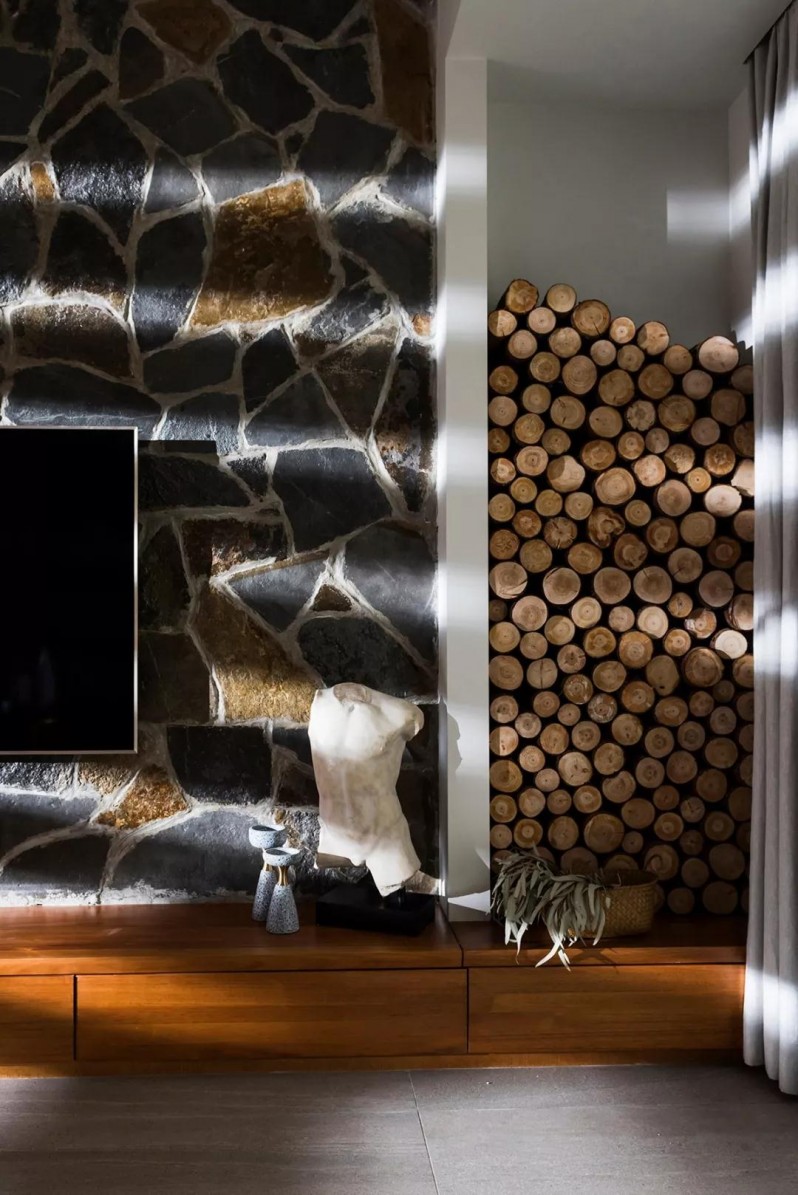 天然亂石打造的電視墻,表達了業(yè)主對自然的由衷熱愛。有序地堆放著原生態(tài)木頭,作為空間的特色點綴。