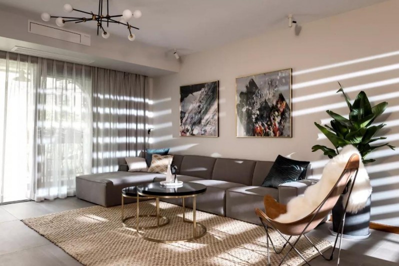 沙發(fā)與窗簾選擇了不同深淺的灰色,加上抱枕與裝飾畫的點綴,簡約且有層次感,舒適不失精致感。