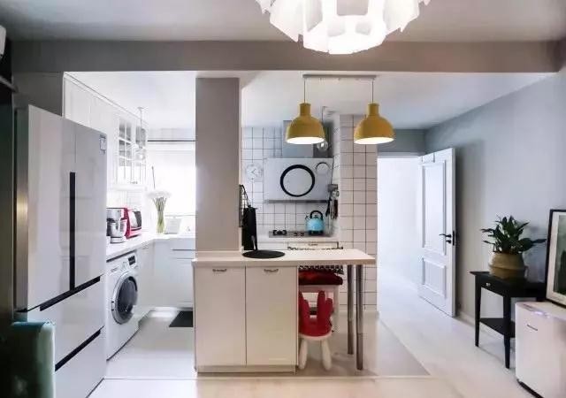 因?yàn)閼粜驮?,廚房直接設(shè)計(jì)成開放式,與餐廳連在一起,櫥柜設(shè)計(jì)成U型,增大了廚房的收納功能,清一色的白色中,各種帶有色彩的小家電作為點(diǎn)綴,可愛又時(shí)尚,餐桌與吧臺(tái)和櫥柜并在一起,吃飯,休閑和閱讀,都能在這搞定,簡約實(shí)用,亮黃色小吊燈頗顯情調(diào)和浪漫。