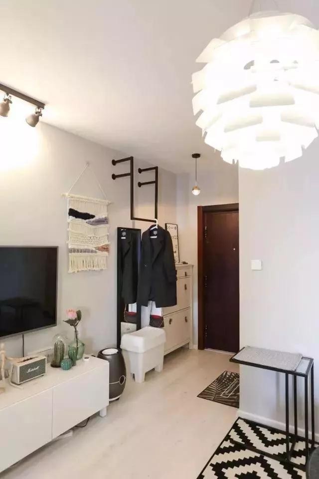 從客廳望向玄關(guān),因?yàn)閷痈卟皇呛芾硐耄孕P(guān)沒有設(shè)置大型玄關(guān)柜,一張成品柜,幾處上墻置物架作為衣架用來掛包包和外套,更顯輕盈簡約,天然的大白墻和淺木色地板,營造舒適又不顯壓抑的居家環(huán)境。