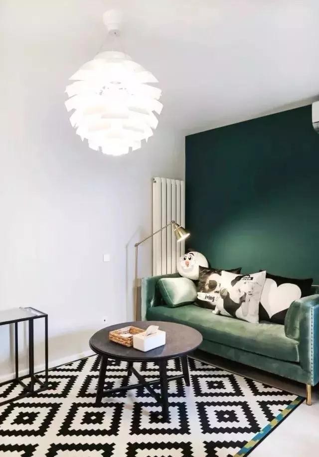沙發(fā)背景墻刷成了與沙發(fā)色彩一致的墨綠,就像兩位老人一般,歷經(jīng)歲月沉淀,沉穩(wěn)大氣依然不失個(gè)性和魅力,黑灰色小茶幾下鋪著一張黑白兩色菱形地毯,時(shí)尚耐看又低調(diào)內(nèi)斂,營造寧靜休閑的氛圍,客廳比較小,所以沒有很多家具做陪襯。