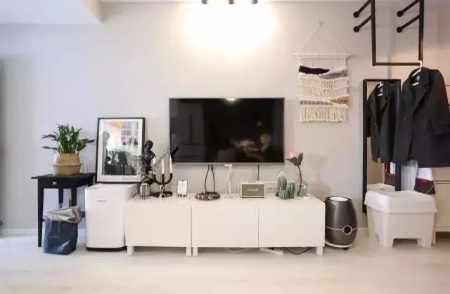 電視背景墻依然是白色的,與電視柜正好互相呼應(yīng),因?yàn)楸尘皦臻g有限,所以只安裝了電視。同時(shí),怕?lián)倪^量的白色造成視覺暈眩和審美疲勞,所以用了很多有意思的小物件做緩沖,綠植和裝飾畫也是必不可少的,清新宜人還富有時(shí)尚感。