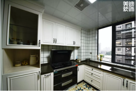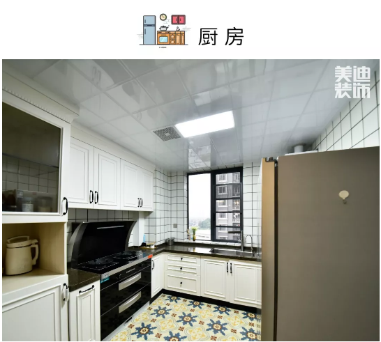 美式廚房,簡潔明亮,廚房地面通鋪花磚,立面小白磚搭配白色櫥柜,深色麻點臺面耐臟易打理。