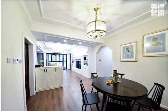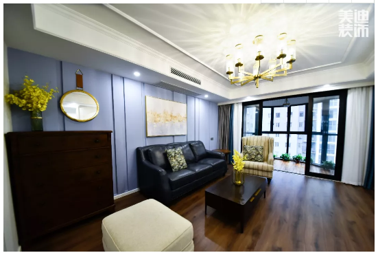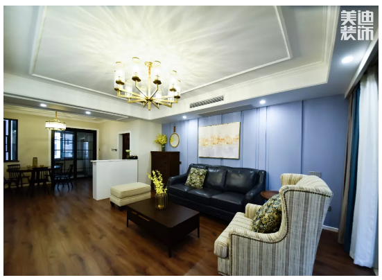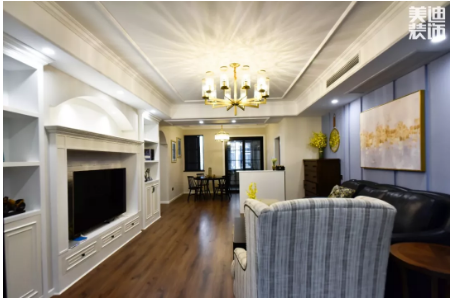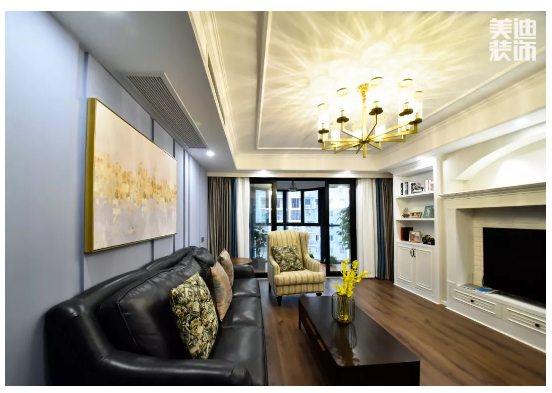 客廳設(shè)計具有美式風(fēng)格的大氣典雅,同時帶有些許北歐時尚簡約感,空間偏理性低調(diào),線條簡潔利落,絲毫不拖沓,快節(jié)奏中又帶著一絲慢調(diào)。