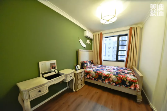 次臥居住的是男主人和女主人,選用綠色調(diào)作為床頭背景,多了一份清爽和生動,給人寧靜舒緩的感受。床頭柜旁放置了梳妝臺,增添空間機能,床頭的羽毛裝飾點亮了整個臥室,美得很有特色也很有個性。