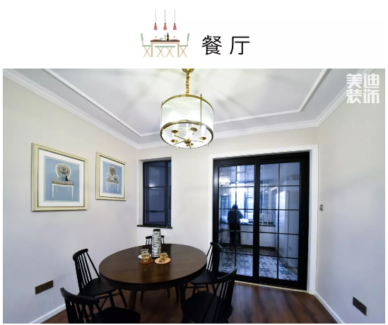 木質(zhì)的餐桌搭配簡單的餐椅散發(fā)著濃郁的美式氣息,簡單兩副裝飾畫就避免了墻面的空洞感,燈具也很簡單實用。
