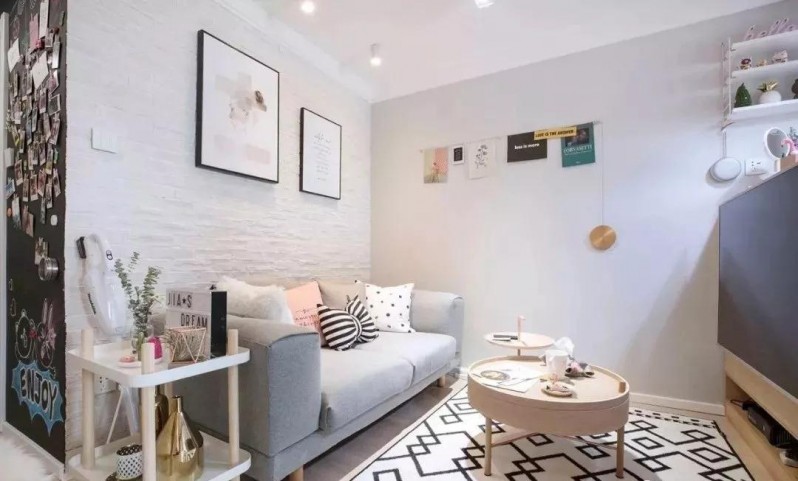 沙發(fā)背景墻用白色文化磚做點(diǎn)綴,雖然同是白色,卻比只刷白漆的墻面多了幾分線條感。灰色沙發(fā)搭配原木色家具,穿插一抹粉色調(diào),俏皮清新。