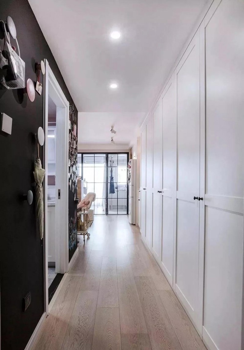 入戶右側(cè)墻面安裝白色通頂柜,滿足空間儲(chǔ)物需求;左側(cè)墻面安裝磁性黑板墻,上面安裝有圓形掛鉤,可用于掛帽子、衣物等。