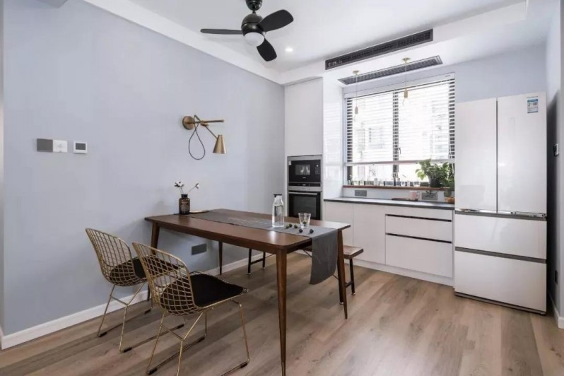 有些人家的廚房太小,實(shí)在擠出位置放冰箱,會(huì)選擇把冰箱放餐廳。餐廳面積寬敞,在窗邊設(shè)置一個(gè)西廚區(qū),冰箱、微波爐、烤箱都放這,使用方便。