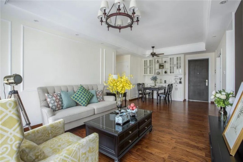 米色沙發(fā)背景搭配同色系的沙發(fā),點(diǎn)綴幾個(gè)清新淡雅的抱枕,原來美式也可以有小清新的一面。高純度的藍(lán)色&黃色窗簾,成為整個(gè)空間的亮點(diǎn)。