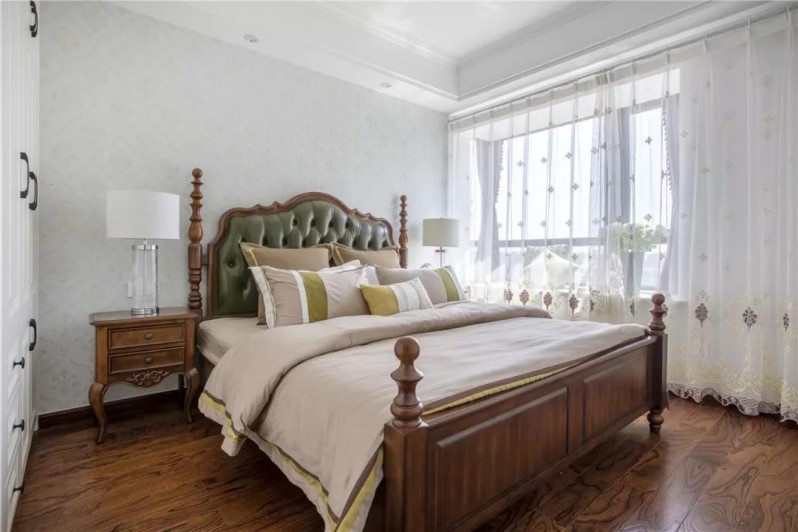 臥室以木紋色為主色調(diào),荷葉綠做點(diǎn)綴,高雅又奢華。但在淺色系墻面的襯托下,卻更顯得穩(wěn)重、性感又低調(diào)。