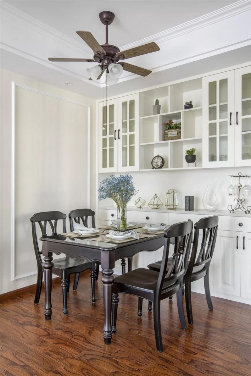 米色烤漆餐邊柜與星空黑餐桌椅形成對(duì)比,古銅色燈具電風(fēng)扇質(zhì)感又實(shí)用,組合在一起很耐看。