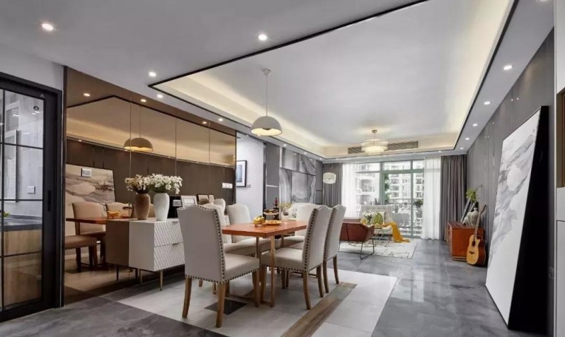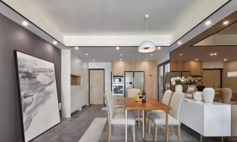 餐廳鏡面金屬,增加了空間的時尚感,大幅印象掛畫落地而棲,古典與現(xiàn)代碰撞相容,瞬間提升居家品味。