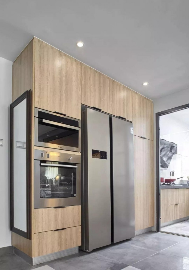 進(jìn)門左側(cè)的西式高柜設(shè)計,滿足主人不同的烘焙需求,硬性功能上也是應(yīng)有盡有。