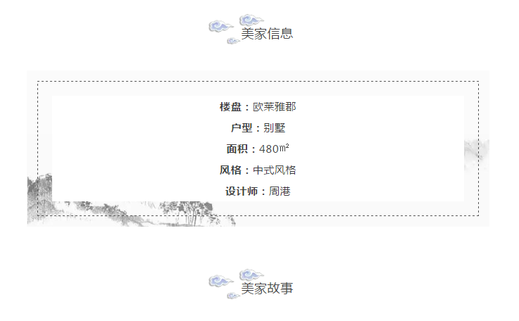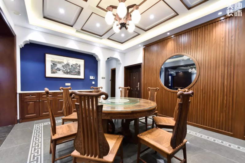 墻面運用的是中國風如意回紋造型,再掛上一副山水畫,充滿詩意的場景油然而生。
