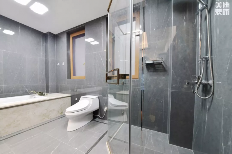 衛(wèi)生間采用高級灰色調,整個空間明亮簡潔,墻面磚采用錯拼的方式,使空間更具層次感。