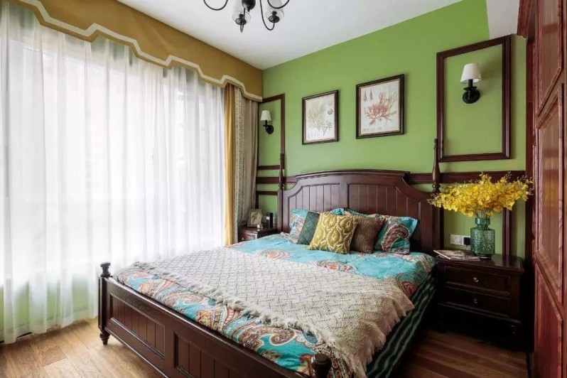 主臥延續(xù)森林綠的床背景,深木畫(huà)框與裝飾畫(huà)點(diǎn)綴造型。