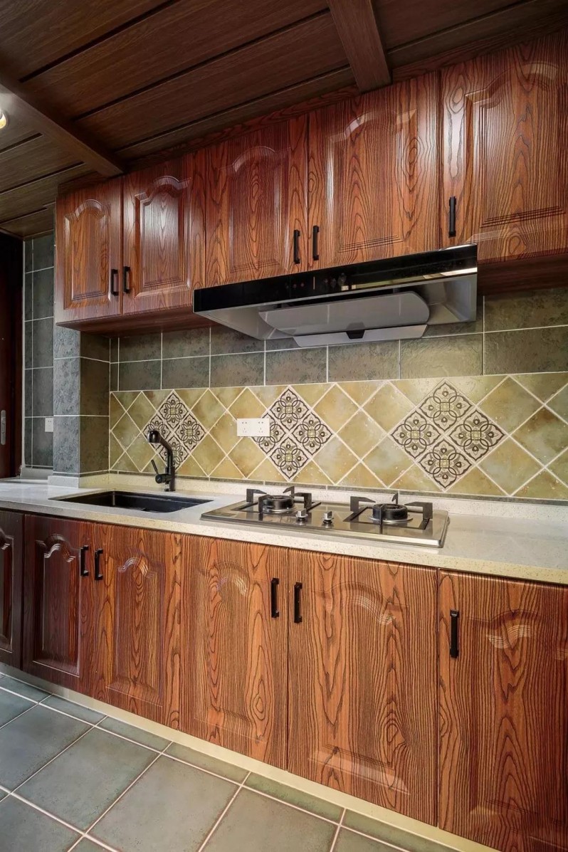 木紋櫥柜搭配復(fù)古地磚、花墻磚,頂面設(shè)計(jì)采用木色拉槽處理。