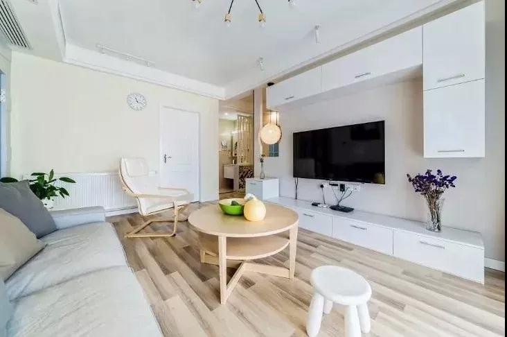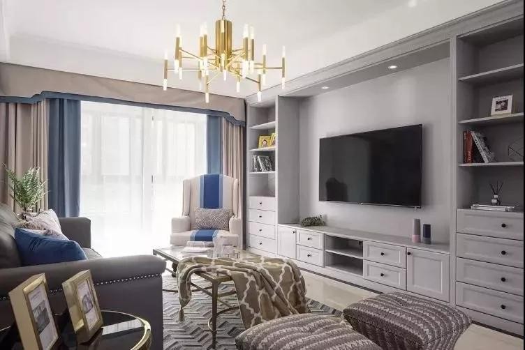 電視墻只用來掛電視,那就太浪費了。不如做些墻面電視柜,可以收納客廳的雜物,保持空間干凈整潔,客人突然來了,也不擔(dān)心收拾不過來。