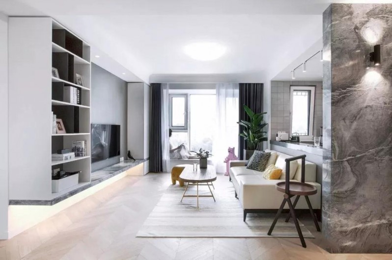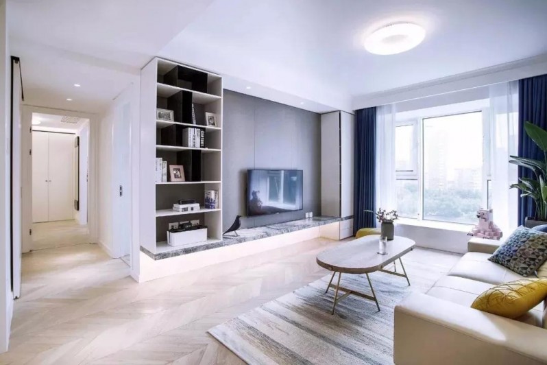 客廳設計整體保持簡約,淺色木地板+白色儲物柜,淺色搭配讓整個空間更顯敞亮。