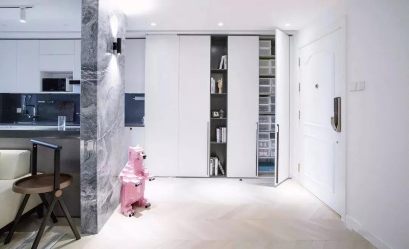 入戶靠墻做了整排柜子,白色柜門與白墻融為一體,視覺上并不覺得柜子占用了空間。