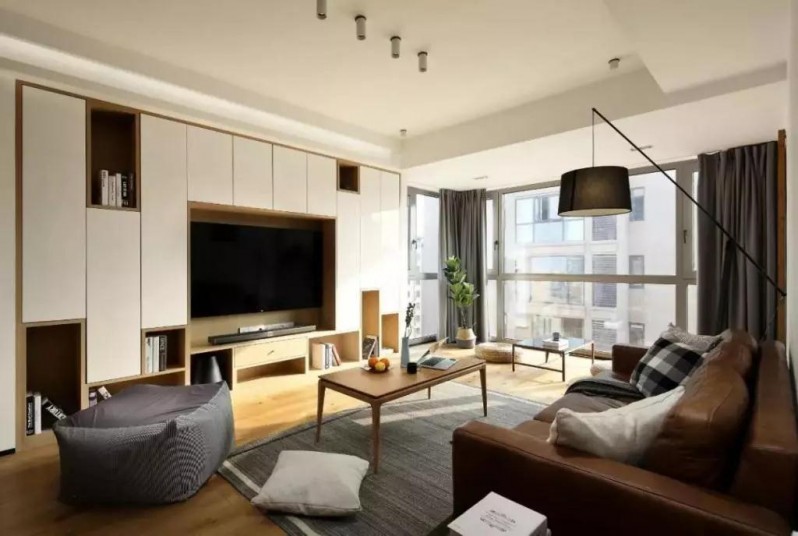 客廳的空間很寬敞,電視背景墻做了一整滿墻的原木收納柜,中間留出空間掛電視,簡(jiǎn)約又實(shí)用。沙發(fā)背景墻是簡(jiǎn)單的大白墻,搭配了深咖色的沙發(fā),還有原木的茶幾,看起來很溫暖舒適,而且客廳靠近窗子,采光效果超級(jí)好,整個(gè)空間看起來都很溫暖干凈。