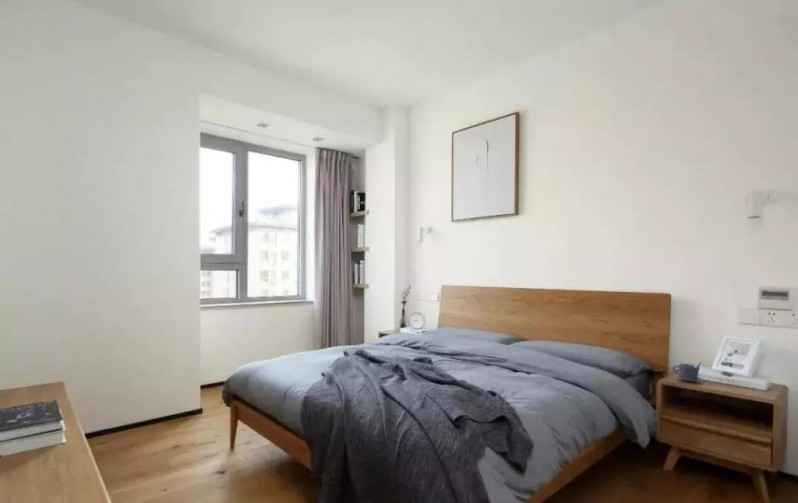 主臥布置也很簡(jiǎn)單,全屋都是大白墻,地面是木地板,還在床頭掛一副簡(jiǎn)單的掛畫,淺木色的床搭配灰色的床鋪,整個(gè)空間都很簡(jiǎn)約舒適,也很有品味。