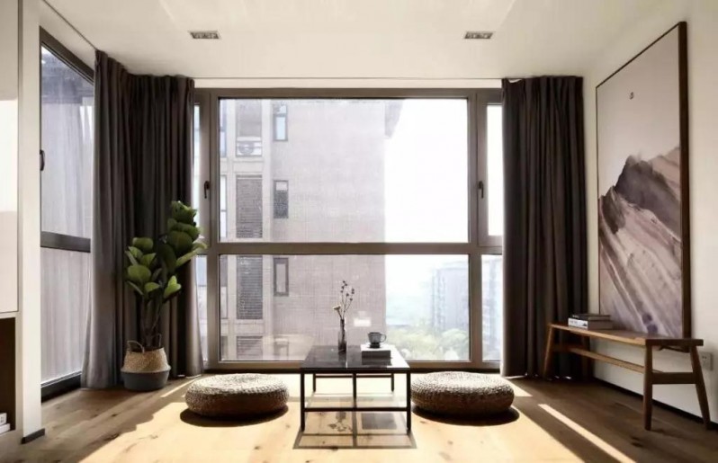 客廳的陽(yáng)臺(tái)打通了,并把陽(yáng)臺(tái)納入客廳,陽(yáng)臺(tái)上做了榻榻米,靠近窗子擺放上一張小桌子,兩個(gè)小蒲團(tuán),還有大盆綠植,真的很悠閑愜意。