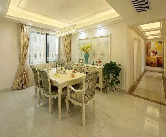 餐廳與客廳沒(méi)有明顯劃分,色調(diào)延續(xù)了客廳的主調(diào),同樣的背景墻紙加上同樣的窗簾,連家具都是跟客廳配套的。一致的風(fēng)格才能讓整個(gè)空間更具整體性。窗簾與家具都是業(yè)主專門訂做的,花費(fèi)了女主人不少心力。