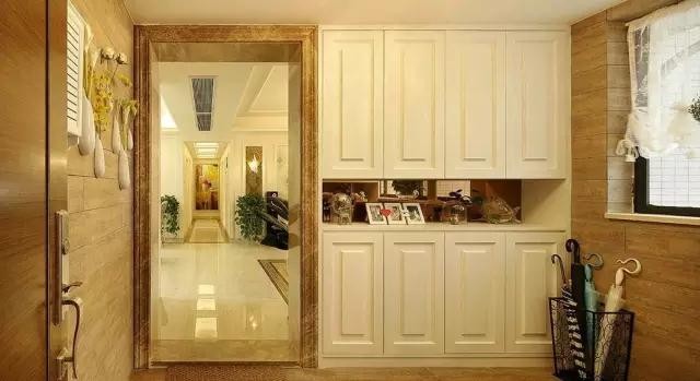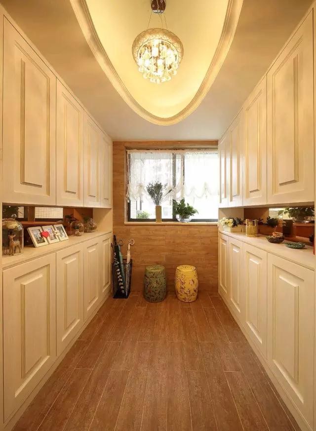 兩排大大的儲(chǔ)物柜極大地滿足了一家人對(duì)儲(chǔ)物的需求,中間鏤空的部分被女主人拿來(lái)擺放一些照片和隨手買的小物件。歐式的門板與上面的歐式天花造型相呼應(yīng),簡(jiǎn)約大氣的感覺(jué)。