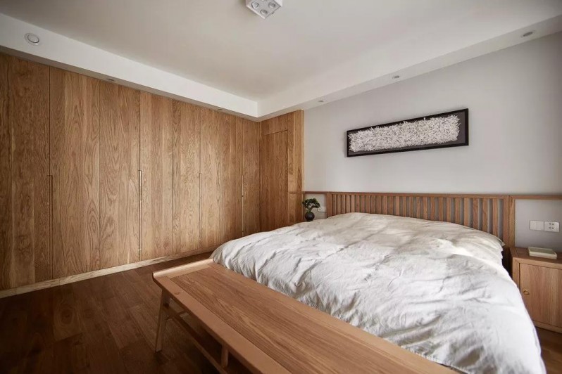 主臥的空間還是挺寬敞的,地面是木地板,墻面也是木板的,大衣柜嵌入墻面,衣柜沒做把手,和墻面融為一體,還有原木的床頭柜,,一點多余的家具、裝飾都沒有,顯得臥室很溫馨寬敞。