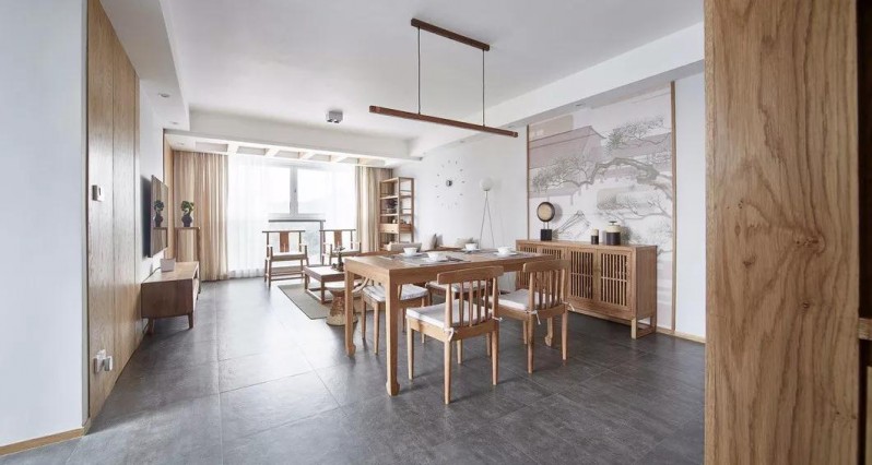餐廳是開放式的布局,就在客廳的一旁,還是原木的餐桌椅,造型簡單大方,旁邊還有同樣是原木的餐邊柜,餐邊柜緊靠墻面,墻面掛了一副簡約的掛畫,很有日式風(fēng)格。