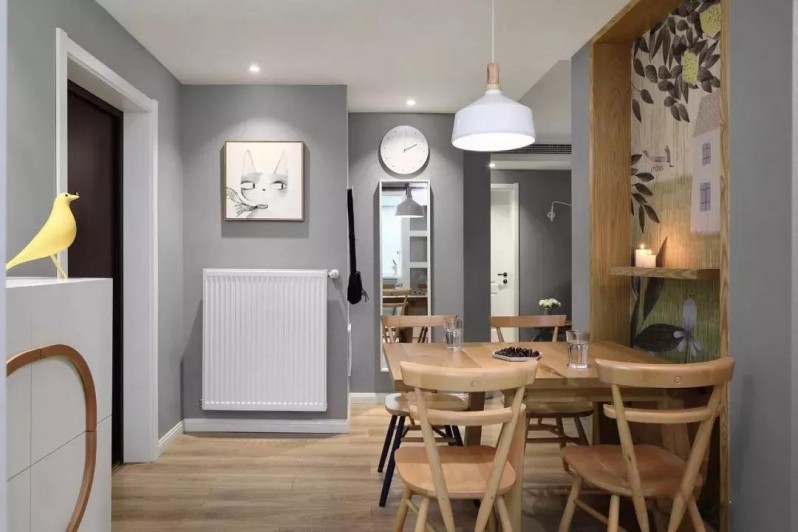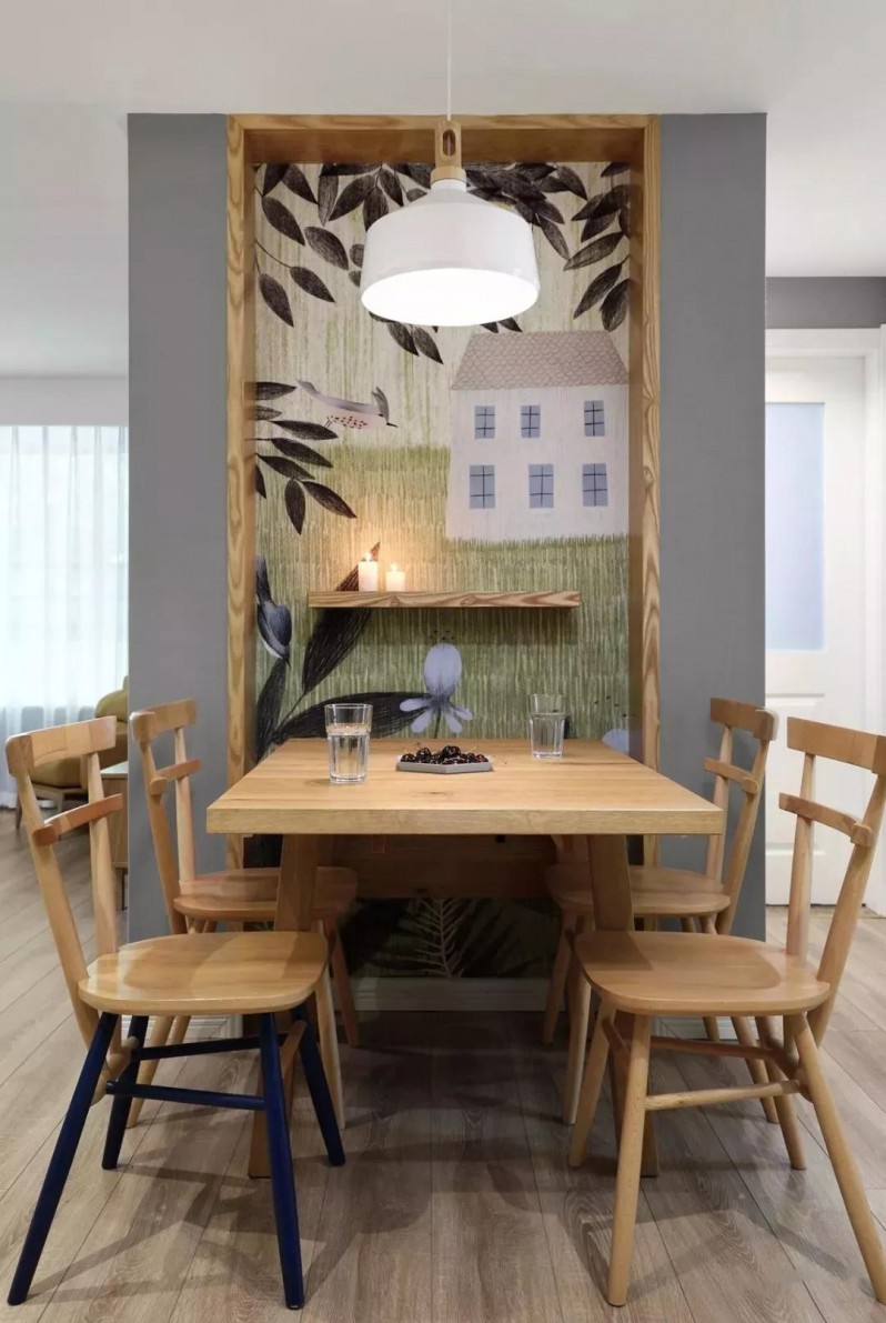 木作餐廳靠墻擺放,墻面用木框和春景圖案壁紙做裝飾,造價(jià)低又好看。