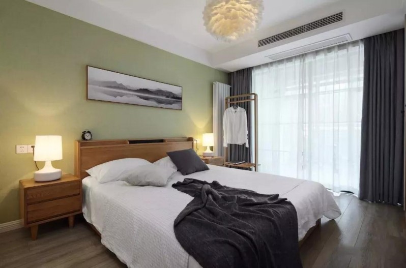 主臥,原木色床配合淺綠色墻布,營(yíng)造安靜舒適的就寢氛圍。